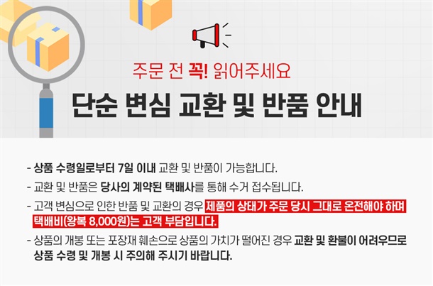 · 단순변심 교환/반품 시 왕복배송비 8,000원 고객부담 (개봉 후 불가)