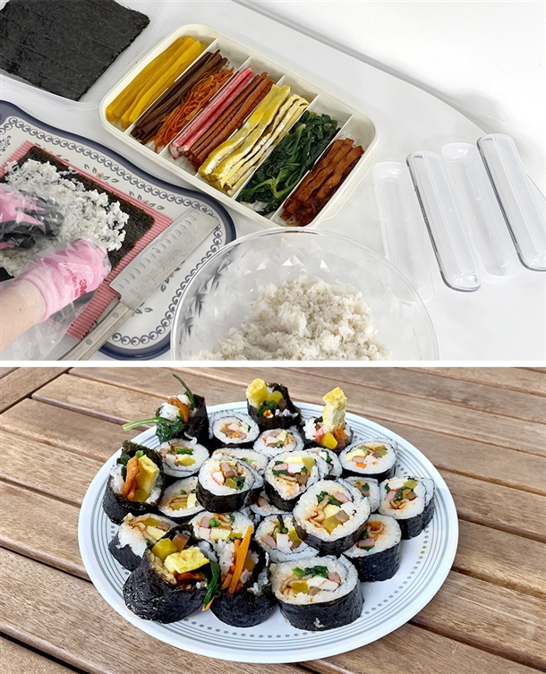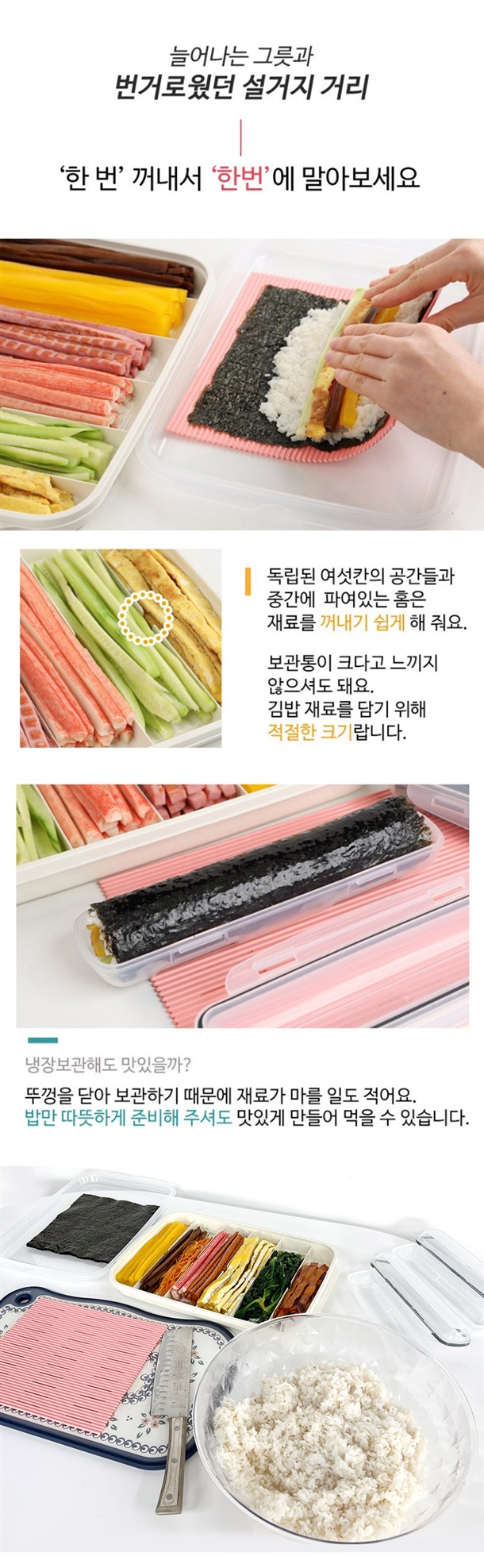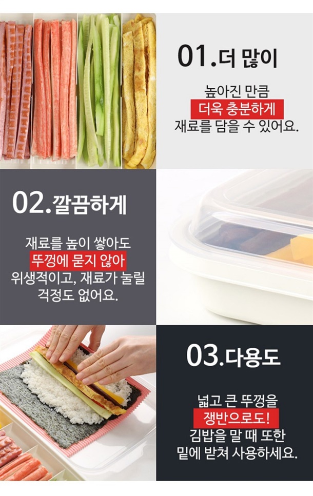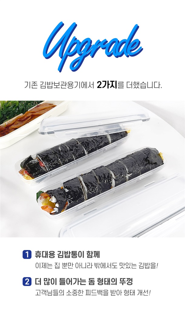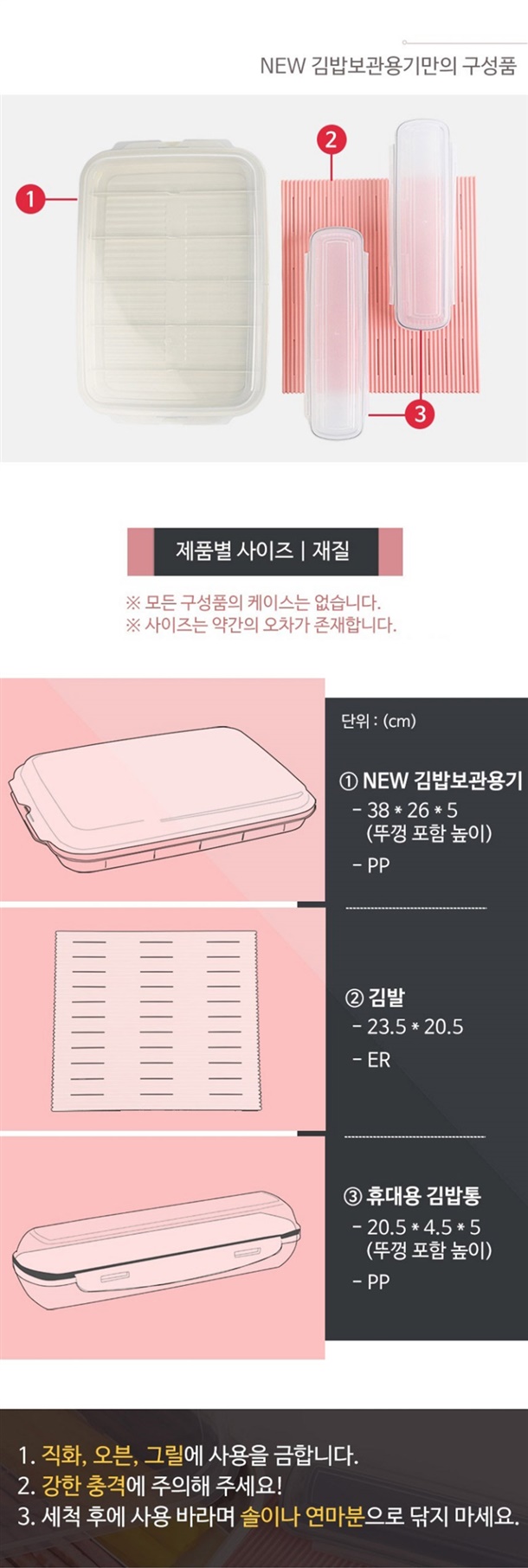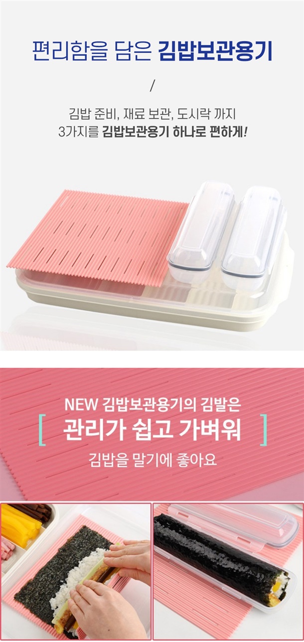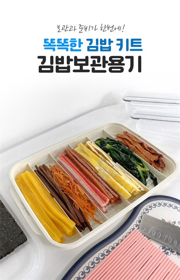 보관용기 1p, 뚜껑 겸 쟁반 1p, 김발이 1p, 휴대용 김밥통 2p, 뚜껑 2p